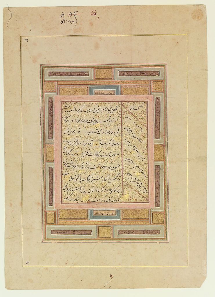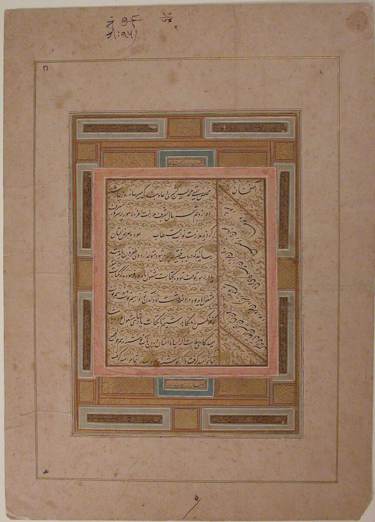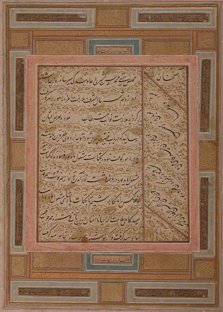 “The artist who, in the shadow of the throne of His Majesty, has become a master of calligraphy is Muhammad Husain of Kashmir. He has been honoured with the title Zarrinqalam, the gold pen. He surpassed his master maulana Abdul-Aziz.., art critics consider him equal to Mulla Mir Ali” (Ain-i Akbari, vol.1, pp.102-3).