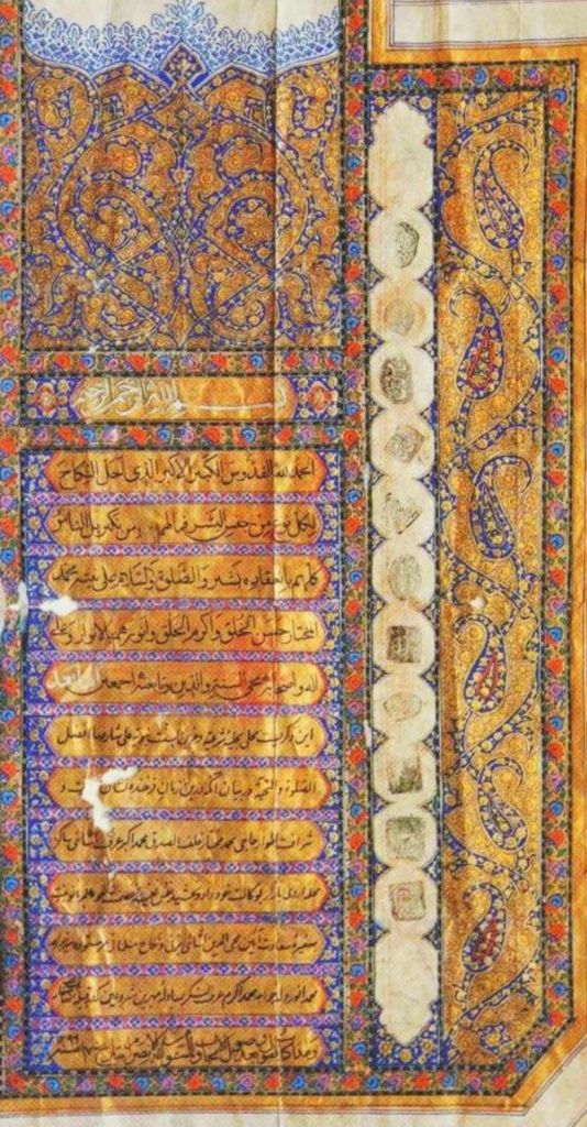 The story of Kashmiri calligraphers can be brought to a conclusiom by mentioning a colophon in a manuscript of Dīvān (collected poems) of Nawab Yusuf Alikhan the nawab of Rampur (in Uttar Pradesh) from 1855 to 1875. The manuscript was copied in Lahore by Muhammad Nazir ‘Ali ibn Sayyid ‘Ilwad ‘Ali Gardizi, and illuminated by Muhammad Hasan ibn Mulla Muhammad Ali, also called khūshnavīs Kashmiri.  Khūshnavīs denotes a caligrapher. He is characterized as a great expert on lapidary work, coloring, and gold work, and regarded as a peer of Manil (a legendary instructor of painting in Persia) and equal of the greatest Persian painter, Bihzad.