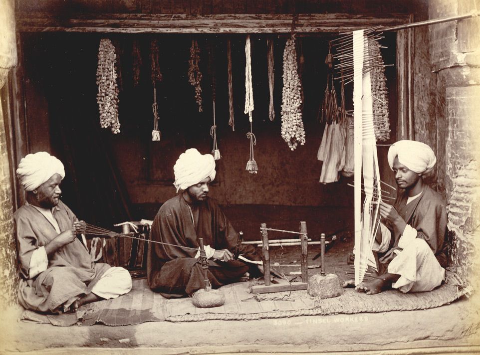 “Photograph of tinsel workers in Jammu & Kashmir in India, taken by an unknown photographer in the 1890s. This image shows three seated workers with the tools of their trade. The tinsel wires are made of silver, or silver coated with gold leaf, and made into a bar in the shape of a candle, which is then forced through a series of holes on a steel plate to obtain increasingly fine-gauged lengths. Traditionally the wire was then wound onto a reel, as seen in the photograph, attached at the other end to a jantar, another steel plate, which allowed for futher refining of the gauge, and wires no thicker than a hair were obtained this way. A tola (180 grains of metal) usually produced 600 to 1,200 yards of wire.” via: British Library
